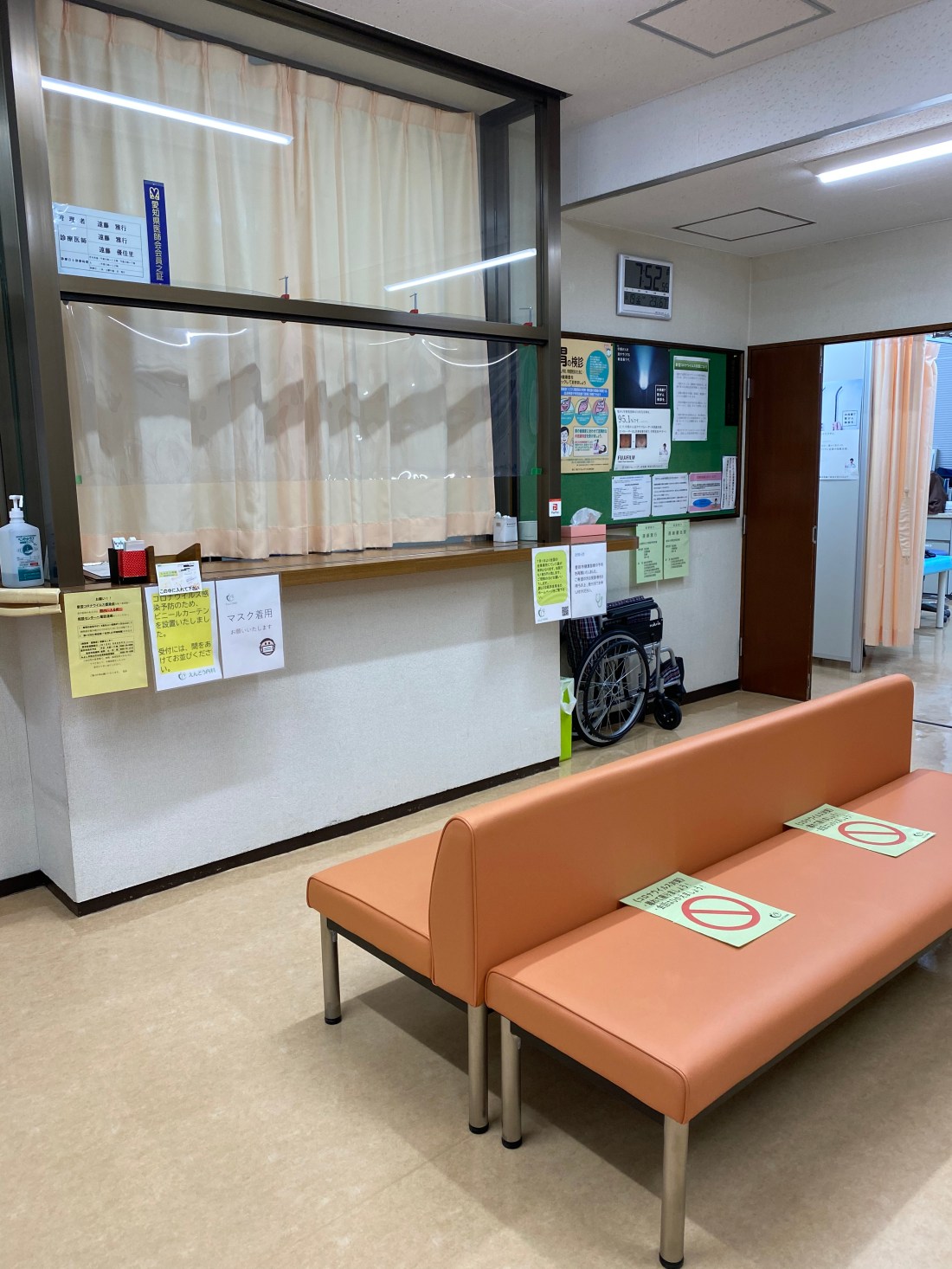 待合室:オレンジ色の椅子を配置した明るい待合室です。自動血圧計を設置しており、患者さんはこちらで血圧測定をしていただきます。新型コロナウイルス感染対策のため、受付にはビニールカーテンを設置し、雑誌・リーフレット等は設置しておりませんのでご了承ください。