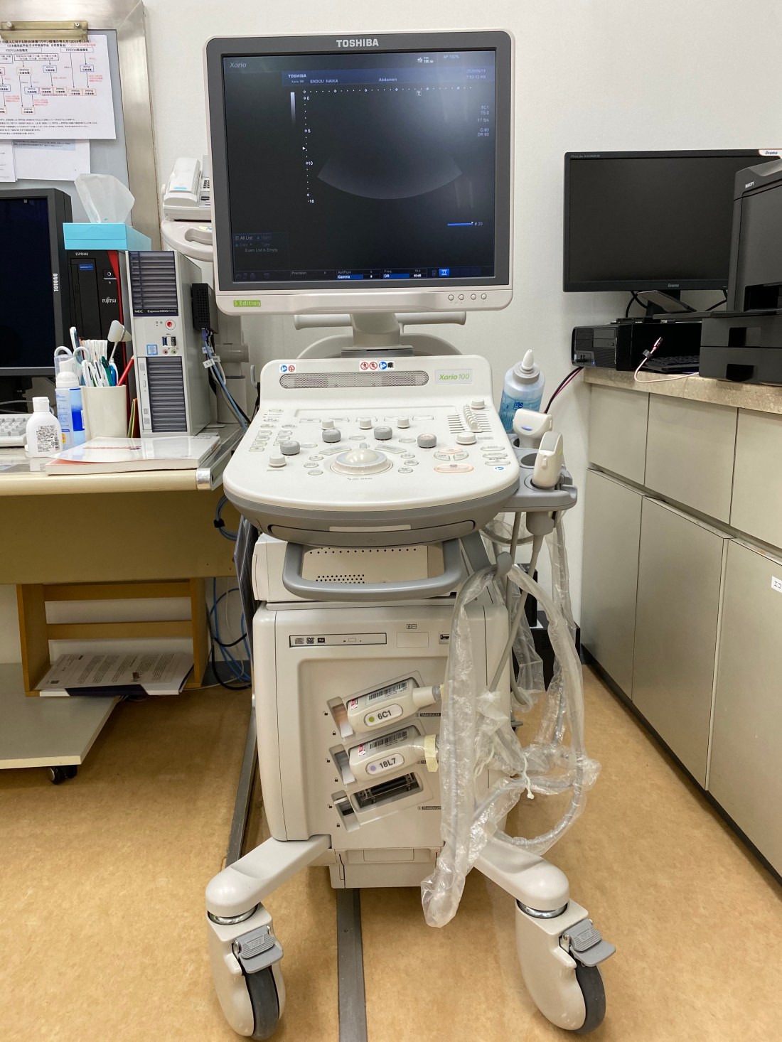 超音波診断装置:診察室に設置してあり必要時に検査が出来るようにしてあります。画像はネットワークを介してPACSに保存されます。